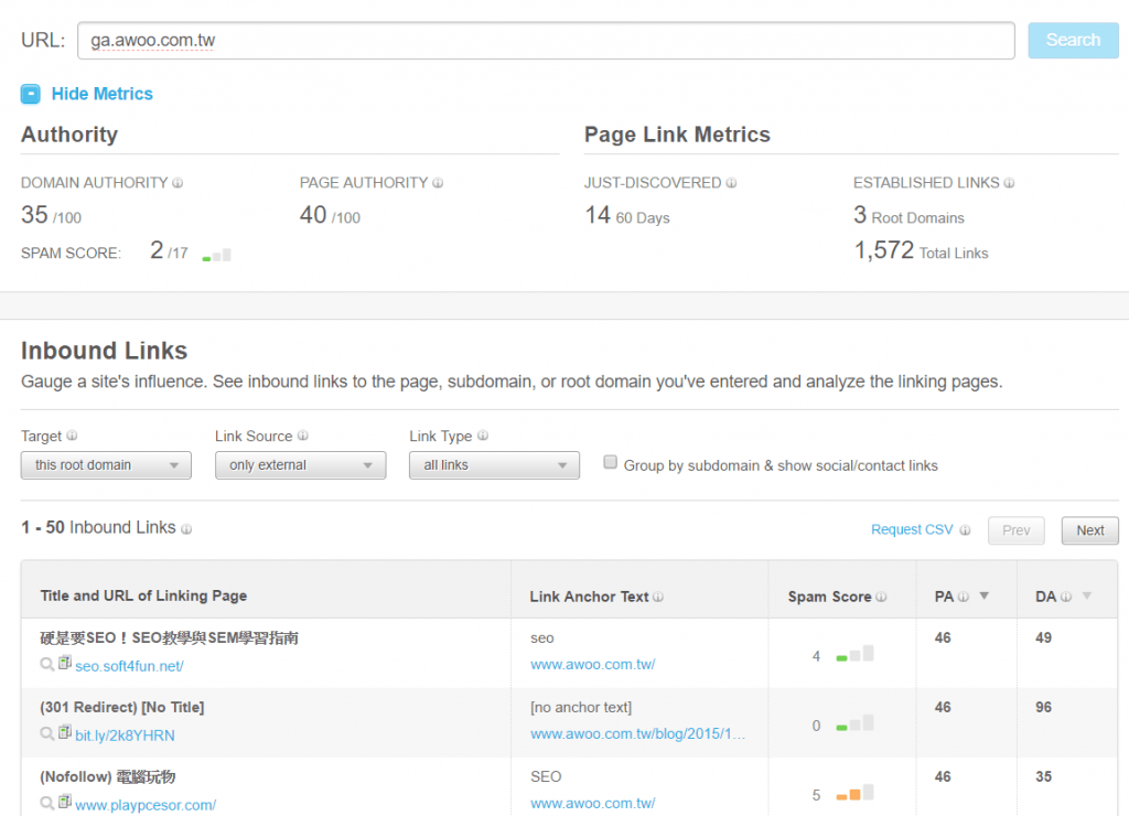 用OpenSiteExplorer 你只要輸入對手的網(wǎng)址,它的外鏈清單就可以一覽無遺,從這個清單中你可以看到對手的PR 策略、媒體經(jīng)營策略、他們是否有投稿到哪些媒體、有在哪些論壇露出、有跟哪些博客合作.. 等資訊你都可以得到。